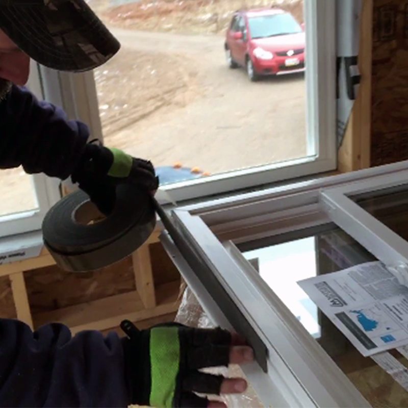 After cutting on the starter strip and peeling away the release liner, installation of MST on window and door frames begins on any side near the middle of the frame. The pressure sensitive adhesive backing holds the tape in place as it is unrolled.
